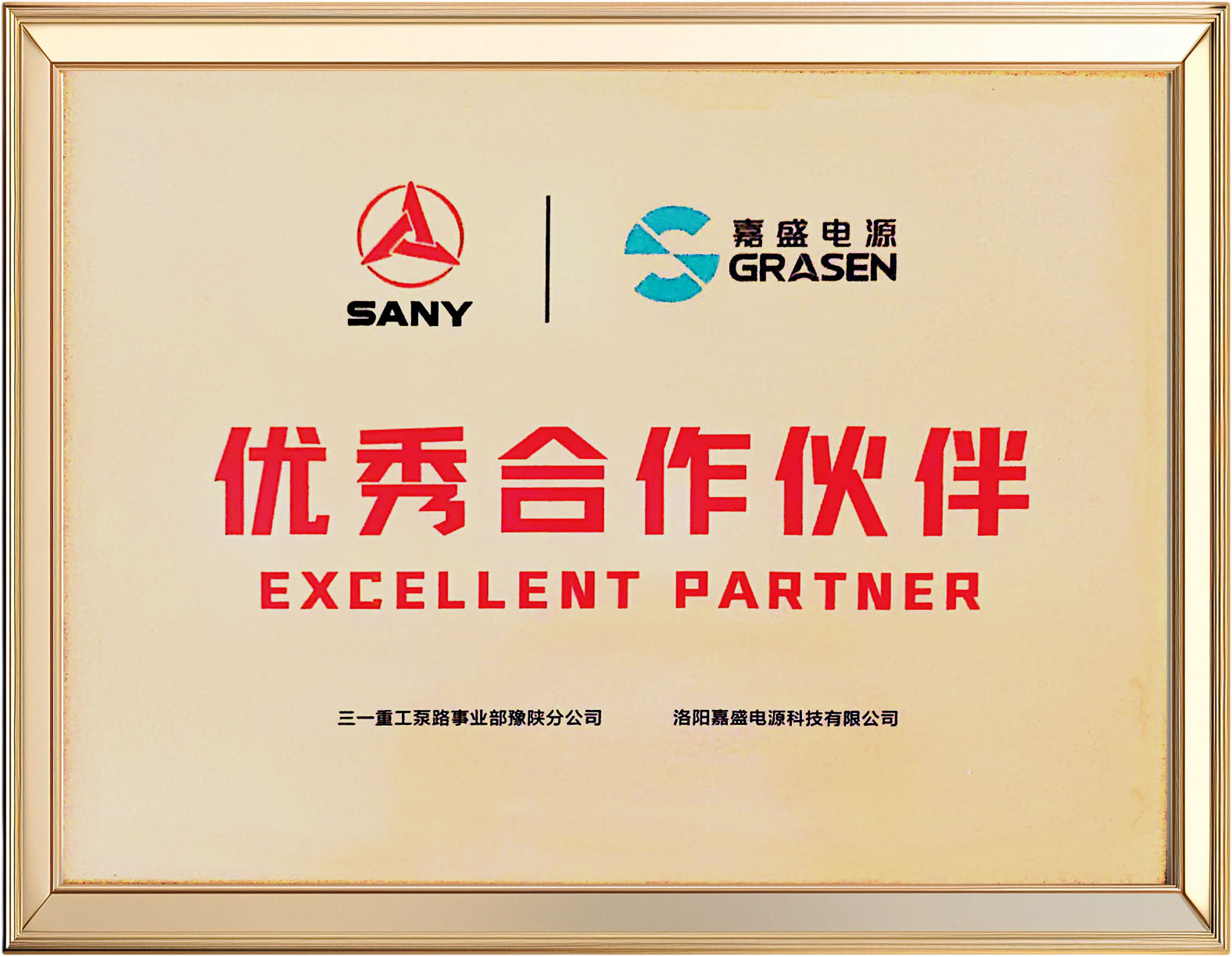 近日,嘉盛电源凭借的产品品质与深度的技术服务,荣获三一重工泵路事业部豫陕分公司颁发的 “合作伙伴” 奖牌。这份荣誉,不仅体现了对嘉盛电源的高度认可,更是双方在业务领域紧密协作、共赢发展的有力见证。